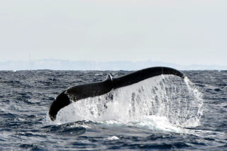 今日は風も波も落ち着き、北の海域も探せました。 天気も良く視界が良いのですが、なかなか見つかりません。 クジラを探しているのは、当協会だけではありません。 沖縄本島からのウォッチング会社も船の上から探しています。 島の北の海域にぞろぞろと船が集まりだしたので、近くを見回すと、居ました!クジラさん!! 少しずつ東に進んでいました。 ウォッチング船が着くころにはかなり沖まで出てしまいました。 10分間隔に短くなり近くでウォッチングできました。