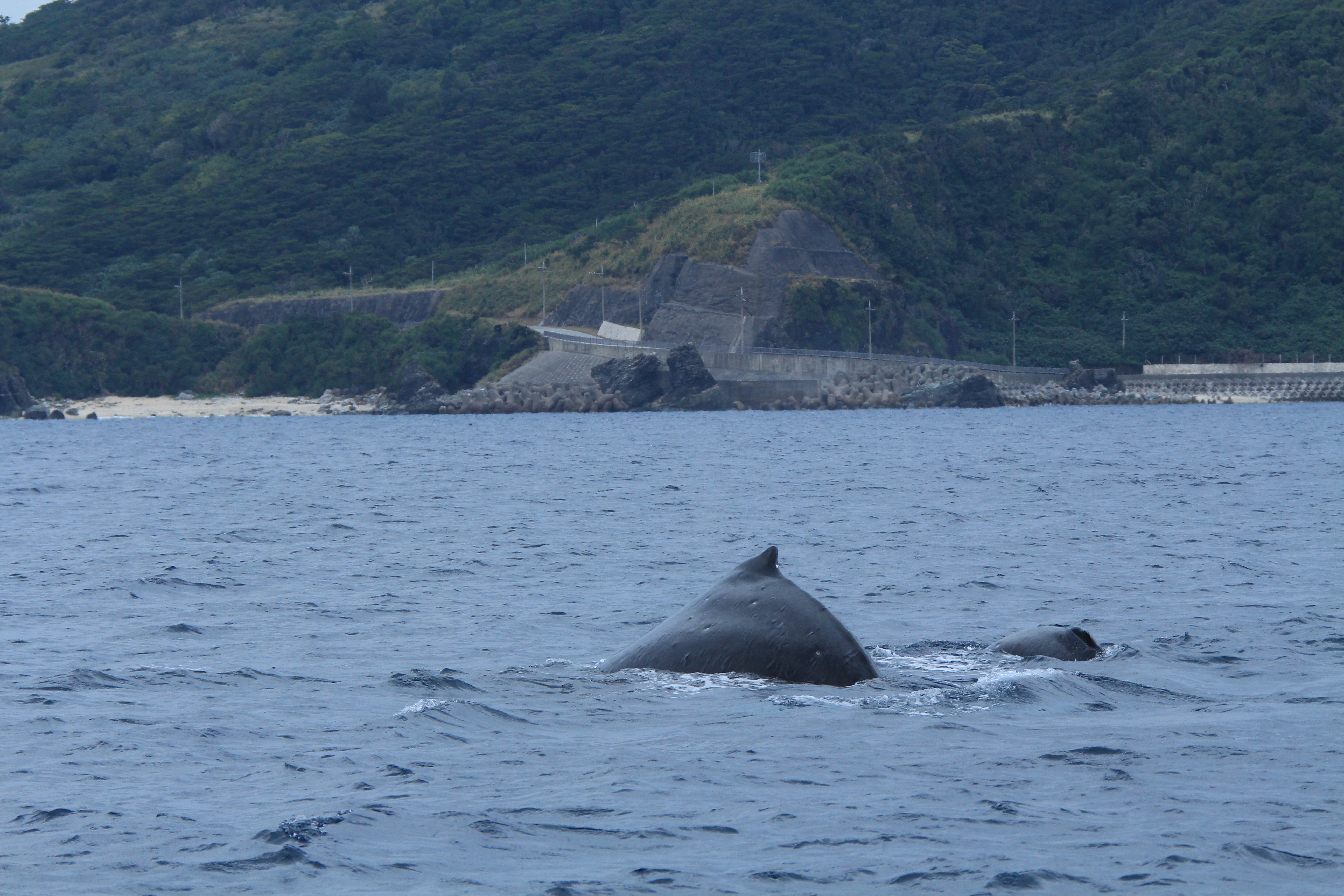 昨日から風が強く午前は中止になりました。午後から風も弱くなり、クジラを探しに展望台へ!北はまだ波が高いので南に出ればいいと思い外地展望台に上るとすぐに、波の穏やかな場所に背びれ発見!次のブロウを待つも出ない!!40分後に少し離れた場所に子供が出てきてくれました!その後お母さんも出てくれました。ウォッチング船も到着しクジラを見ることができました。最近よく見る親子で移動が早いのですが、今日はそんなに早くなくゆっくり見れたと思います。 ※お客様へお願いです。 鯨の個体調査の為に尾びれの写真が必要です。ツアーにご参加いただいた際に尾びれの写真が撮れましたら、ぜひぜひデータの提供をお願いいたします! 恵太