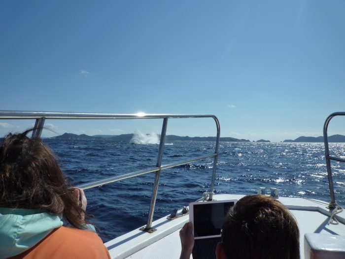 今日は天気も良く久しぶりに北の海域に行けました。ウォッチング船の準備ができるころから続々とクジラが見つかり展望台は大忙しでした!ブローが肉眼で見えたのでキープしやすかったです。ウォッチング船が到着すると合流したり遠くに出たりで、船長さんも大変そうでした。南の海域には親子がいたそうです。午後は座間味島に寄ってきた3頭をウォッチング出来ました。船の近くまで来てくれてお客様は喜んでいました。 恵太