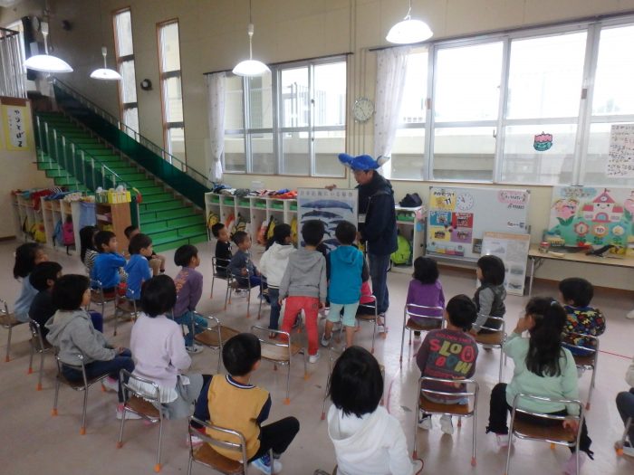 本日の確認総頭数 0頭 中止 鎖国2日目の座間味島です!大時化のため、座間味への船が全便欠航になり、生鮮食品が不足しています。新聞も来ません! 海水のほうが気温より暖かいのでクジラたちはいいですねー。 今日は座間味幼稚園にお邪魔してきました。 事務局長大坪さんは、「つぼっち」の愛称で登場しました。 質問形式で、わかりやすく幼稚園生に、クジラの説明をしていました。 協会に展示してる大きなクジラの、あばら骨やマッコウクジラの歯などを持っていきました、みんな目を輝かせて、持ったり、においを嗅いだりしていました。 子供たちは気になったことを、手を高く上げ質問していました。 つぼっち Q クジラは何を食べてるでしょうか? 園児 A まぐろ!かじき!みじゅん!(イワシの仲間)プランクトン! つぼっち Q クジラはなぜ座間味に来てるでしょう? 園児 A ご飯を食べに!カップルになるため!プロポーズするため! などなど珍解答続出です!幼稚園生らしい回答ばかりでした。 つぼっちはどんな答えにも、優しく対応してました。 授業の後半には、1歳くらいのクジラと同じ大きさにした、ビニールで作成した風船クジラを膨らますと、その大きさにびっくりしていました。 みんな楽しそうに、胸鰭と並んで背比べしたり、よしよしとなでたりしていました。 最後は園児を代表して、楽しかったですとお礼をもらいました。 みんなで見送りもしてくれました。 将来、くじらの調査をしたり、保護する子が出てきて欲しいものです。 明日も波が高い予報です。どうなることやら。 恵太