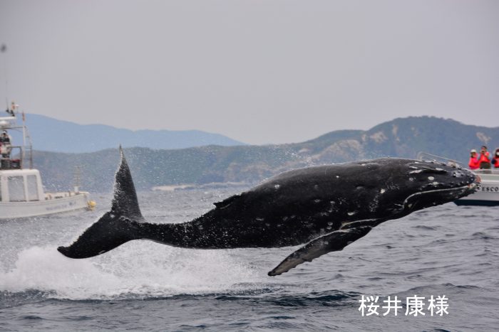 ウォッチング船が到着すると、仔クジラが変わったブリーチしてくれたそうです!