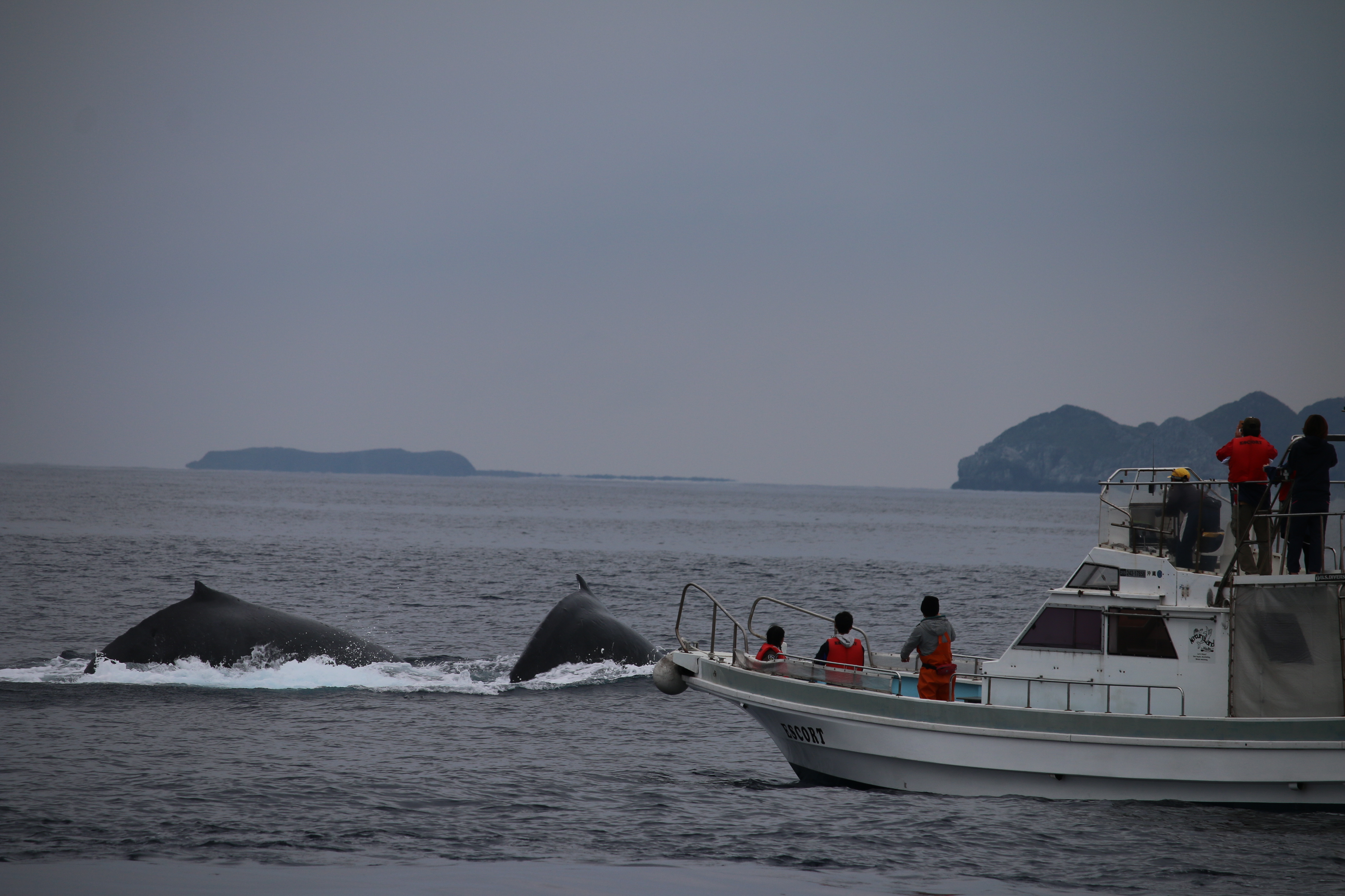 無事に午前のウォッチングがスタートしたのですが、船長さんから「3頭じゃないよ、4頭だよ!」「4頭じゃなかった、5頭いる!」と無線が入りました。メイティングを見るのが初めてだったので、展望台で一人でわくわくしちゃいました(^‐^)