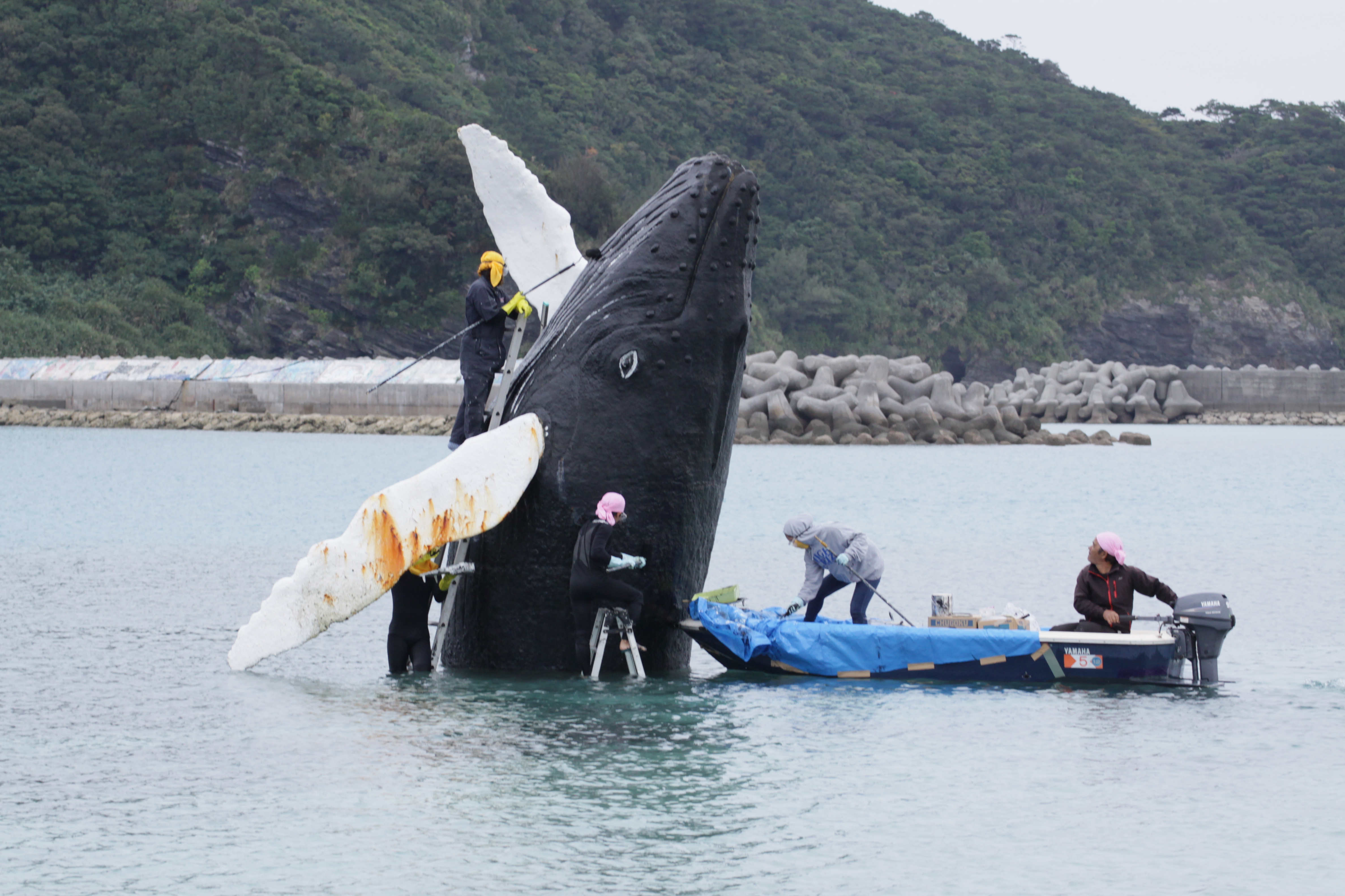南の海域は波が穏やかで、いつも間違える白波も ほとんどありません。 順調に数も増えてきてるので余裕だなと思ったのもつかの間!! まさかの9時超えても見つからず!!!!!!!涙 遠いとこでも行けるから見まわしますが居ません!! またお客様待たすのか~~~胃が痛いな~なんて思ってると! すごーく小さなブローがプシュッ!! 普通はブシューくらい出るはずなんですが! またプシュッ! さては子クジラだな!!! ブローも5分間隔で3回! お母さんがとなりで出てくれるはず!! プシュッ! 1本しか出ない????? ブロー間隔が10分になり少し東に移動! 船長さん達が準備する中、実はロスト! やばいな~! ただでさえブローが小さいのに~涙 あたりを見回すと海面から大きなとがった岩。 あれ??? そこ岩無いだろ!! とツッコミ入れようとしたら 海中に消える岩!!!!! まさかのスパイホップ!!(笑) 青山テルマの私は~こ~こ~にいるよ♪ ばりのスパイホップ!! まじ助かりました!! ウォッチング船が到着するとまた かくれんぼの始まりです!!! 遅れてきた船長が発見!!! とナイスな連絡!! ブロー間隔が20分になり移動もジグザグ! どうにかお客さん達も見れたようです!! 1Dayのお客様のためにこのクジラは 各船長さんに任せ! 他を探すも全然見つかりません!! 1Dayツアーの船長はゆっくり 南へ捜索に向かいました!! 午後のウォッチング船が来るまで かくれんぼ君をキープしていると! 捜索に出た船長からクジラ情報!! 2回目のブローも確認でき午後のウォッチングスタートです! 午後出発の船長は迷いながらもかくれんぼ君へ向かい やっぱりかくれんぼに巻き込まれました!! 何回かウォッチングしてもう1ヶ所に向かいました。   本日は港にあるクジラのモニュメントのペンキ塗り替えをしました。 毎日潮風に打たれサビサビです。