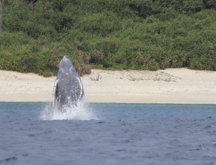 南の展望台へ向かう定期船に乗り確信しました!!! このうねりでは誰も南に来ない!! 降りずにそのまま座間味へ帰港!! すぐさま風の陰になる探鯨場所へ向かい 探すも出てこない!! 朝の情報をもとに夏は観光客でにぎわう古座間味ビーチ近くを 探すと2ポット確認!!!親子×2 急いで早朝ツアーに出ていた船長を案内すると ここだよーーーん!!ぴよーーん!! と子供がブリーチしてくれました!!! そのあとも子供がプカプカ!! もう一カ所は波が高く断念! と思いきやこちらに向かってくるではないですか!! ブローが1本、2本!! 小さいのが1本????? 実はエスコート付!!! 泳いだら背中乗れそうなくらいな距離!! 阿佐区に向かう道にはギャラリーが出来てました!! 午前便が着くころには3ヶ所に分かれたようで エスコートだったクジラは1頭で違うメスを探しに旅へ! ブロー2~3回で大移動!! オスを追い払った親子は安室島で大暴れ!! 子供がブリーチして続いてお母さん!! 疲れたのかゆっくり南に下って行き 波が高くなりお別れ!! 最後はみんな集合でもう一カ所の親子 大暴れウォッチングで午前終了!!! ビーチからも見れてたそうですよ!! 午後は前線通過で土砂降りの予報で中止!! フェリーが入港して続々と午前便のウォッチング船が 帰ってきたら予報通り土砂降り!!! 30分くらいしたら止んで太陽カンカン!! 「よし行くか!!」 と船長さんが一声!!! スイッチオフの協会スタッフは大慌てでお客さんに連絡!! 急いで展望台に上がり親子再確認!! ウォッチング船到着と同時にお母さんのテールスラップで お出迎え!! 前線通過で大忙しのウォッチング協会でしたが お客さんは大満足でした!!!