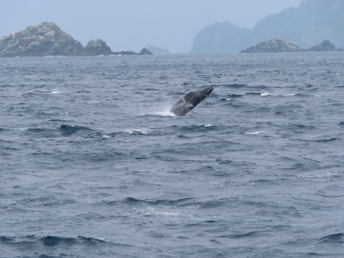 こんにちは! しばらく北風が続いており、なかなか 北の海域に行けない今日この頃です。 海峡が見渡せる高月展望台に着き海の状況を確認していると、 さっそく親子クジラのブローを発見! 発見場所の周辺をぐるぐる泳ぎ回っては豪快なブリーチを披露! そしてもうひとつの展望台からも親子を2組、自分ももう1組発見し 船が出航する前に4組もの親子が島の近くで波風を凌いでいました! 昨日からクイーンざまみが復活しているのでお客さんも増え、7隻が同時に出航! 上から見ていると何かの訓練のようでかっこいいですね~ あまり一箇所に集中しないよう気を配りながら無事全船ウォッチング開始! 阿嘉島の近くいた親子は船を嫌がっている様子だったので船長さんは すばやく別のクジラへ移動。できる限りクジラには負担をかけない 座間味のウォッチングの素晴らしいところですよね。 他の親子はみんな南下し結局近い場所で集まることに! するとどこからか1頭のオスが合流し子連れのメスを狙う 「エスコート」になりました。 みんなが親子を見ていると横でブリーチしてアピール!笑