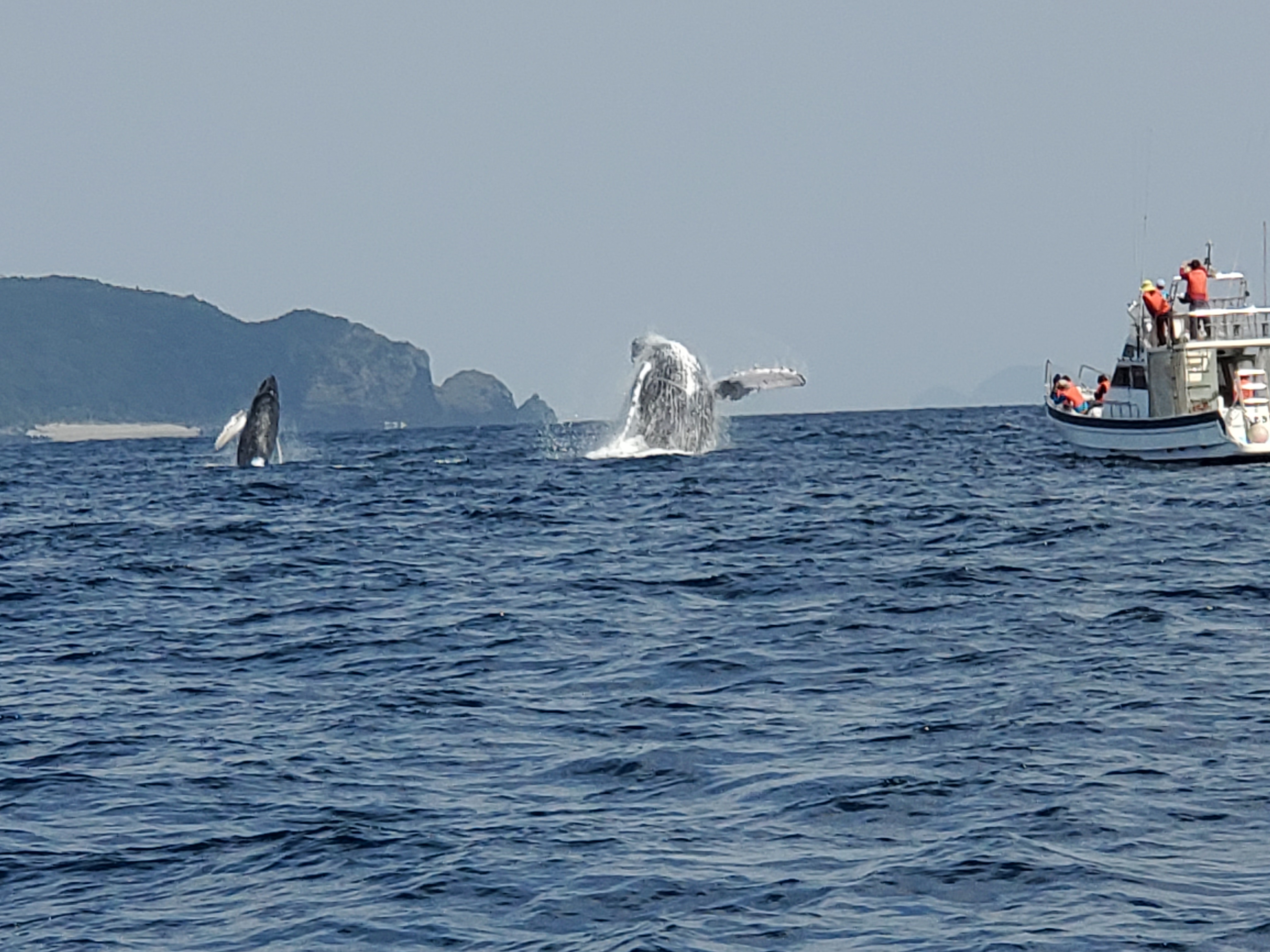 こんにちは! 今日は風も収まりましたが、北の海はイマイチだったので探鯨員スタッフは南の展望台に登りました! 午前中は船長さんが見つけた親子クジラをウォッチング! 午後からも親子クジラ中心に、大迫力のブリーチが見れました(^O^) 2頭のクジラがブリーチしています!!↓