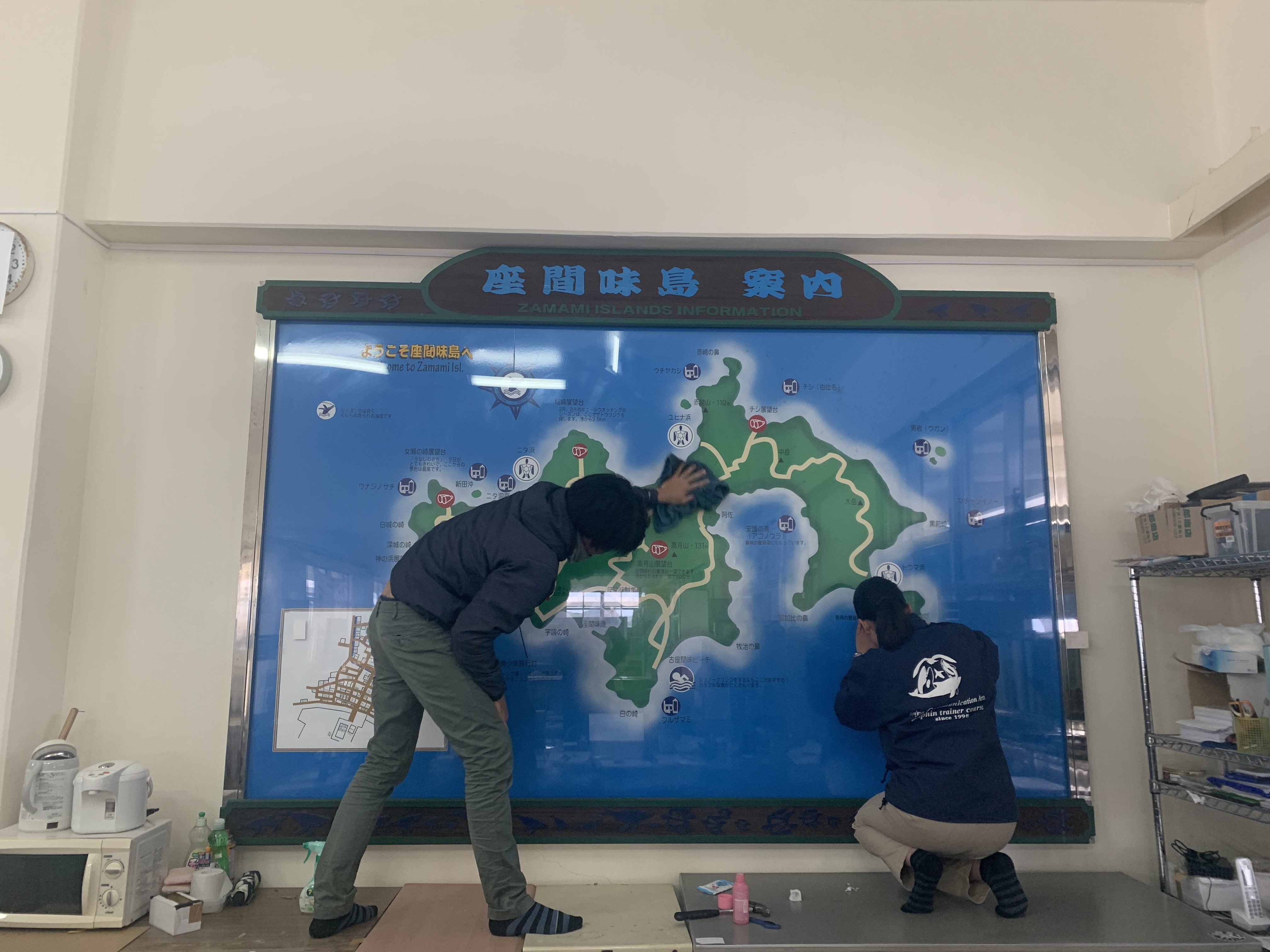 北風ぴゅ~ぴゅ~ 雨もぱらぱら。 数日前まで半袖で過ごしていたのが 嘘のような寒い寒い座間味島、、、 こっちに来て初めてダウンを着ての出勤。 こんにちは!お久しぶりです! 今シーズンは探鯨に行かず 事務作業ばかりのため久々に ブログを書いております(;’∀’) スタッフのはなです。 普段、時化で中止の日は たまった事務作業に追われているのですが こうも時化が続くと事務作業も終わり、 やることが、、、”(-“”-)” ということで、本日は気分を変えるために 事務所の大掃除大会! 壁一面の大きな座間味島マップを磨いたり、 棚や商品の整理をしたり、 事務所がすっきりして 明日から気持ちよく仕事が出来そうです^^