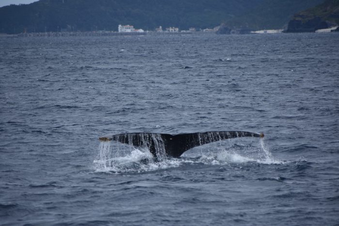 他にも、違う場所で背びれを出したまま泳いでるクジラがいたので、