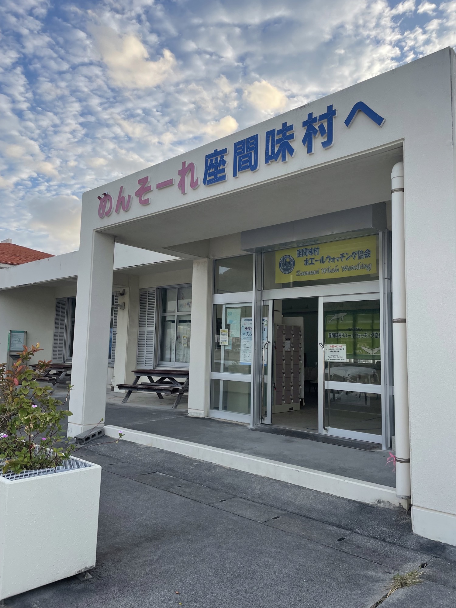 高速船から降りると、目の前に大きな白い建物が見えます。 「めんそーれ座間味村へ」と書いてあります。